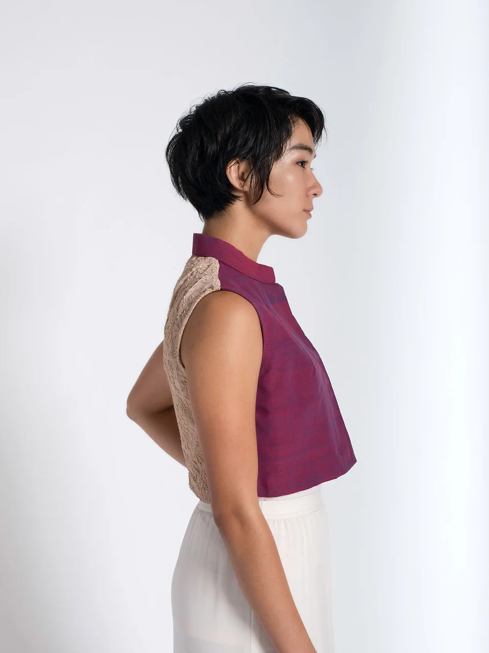Make - This vest with hand embroidered sheer back is made by a dual weave hand crafted khadi fabric. Concealed buttons used for fastening.